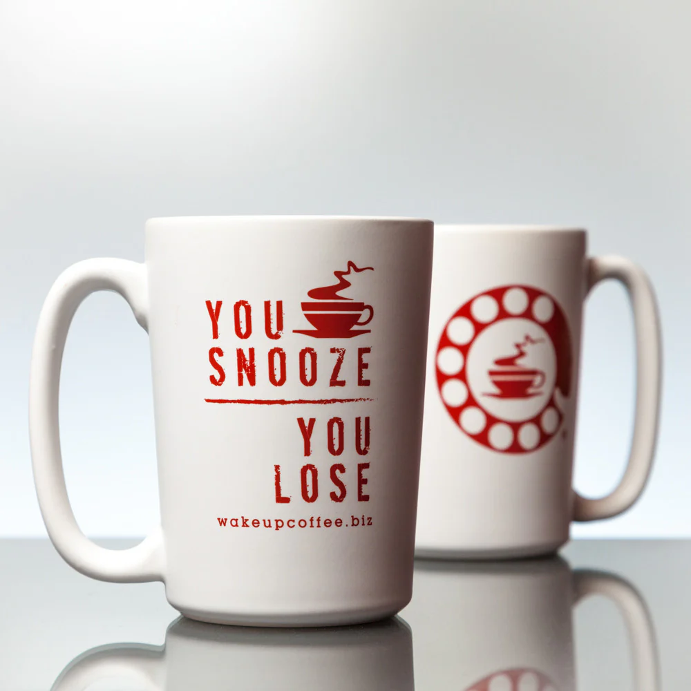 A tall, white, ceramic mug, with a nice long handle... perfect for enjoying Wake Up Call at home. Fill this with hot coffee or hot cocoa and it's better than any pair of mittens!